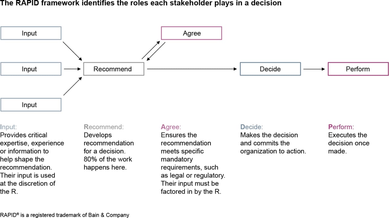 R.A.P.I.D. is an acronym for 5 roles in decision-making. It’s not a sequence. Think of it like a cast list:
